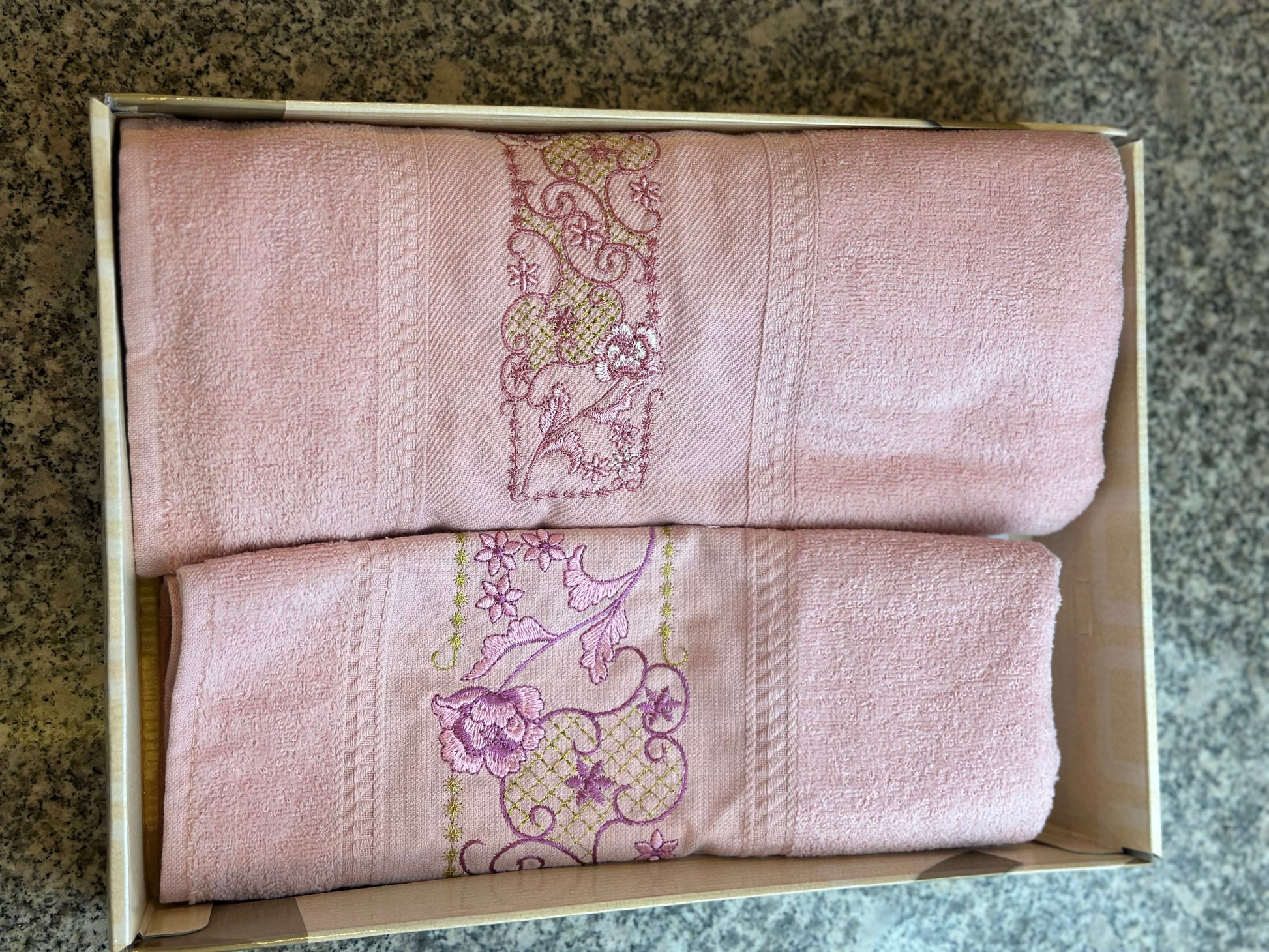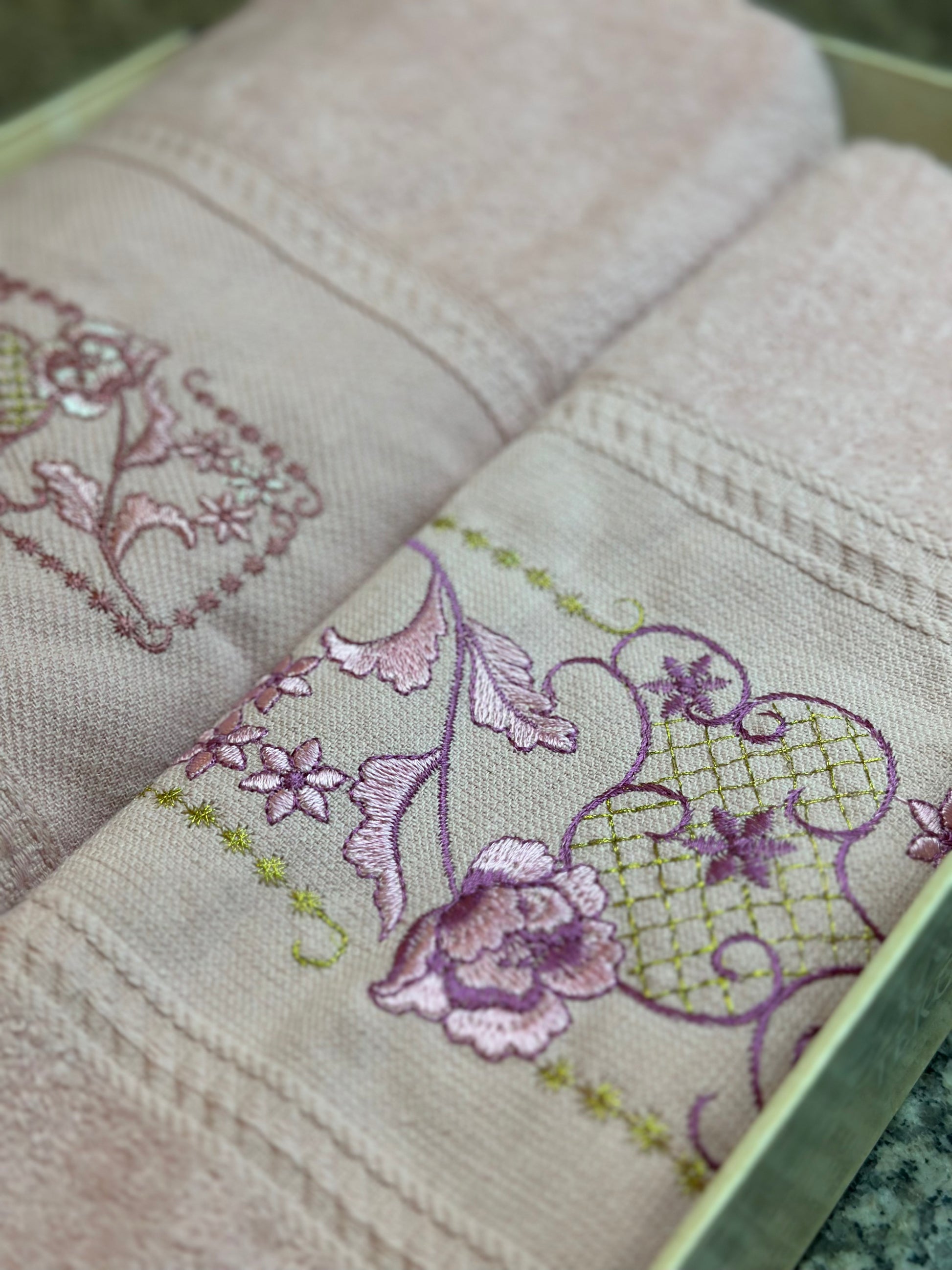 Doğallığı ve zarafeti buluşturan bu havlu seti, banyonuza “otel konforu” taşır. Tamamen pamuk liflerinden dokunan kumaşı, cildinizi tahriş etmeden nazikçe kurular ve yüksek emiciliğiyle sizi yormadan suyu emer. Banyo havlusu 70×140 cm boyutuyla yetişkinler için ideal kapsama sağlarken, 50×90 cm havlu günlük el-yüz temizliğinde ve saç sarmada mükemmel işlevsellik sunar. Nakışlı tasarımı sayesinde şık ve zarif bir görünüm kazanır, banyonuza estetik bir dokunuş katar. Ayrıca pratik kutulu ambalajıyla hijyenik saklama imkânı sunar ve sevdiklerinize hediye etmeye hazır hale gelir.